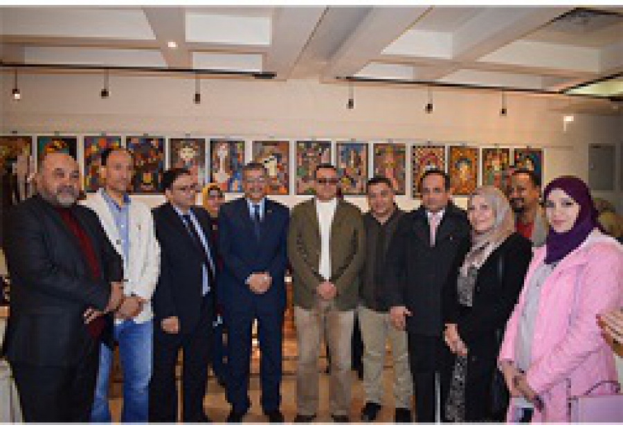 Prof.Dr. Hussien Magraby, the acting university president inaugurates the of art exhibition in a contemporary vision of the students of the faculty of specific education that is held in the cultural center in Benha. The university president is accompanied by prof.Dr. Muhammad Ibrahim, prof.Dr. Rehab Abd el-sattar, and prof.Dr. Lamia Wagdi.